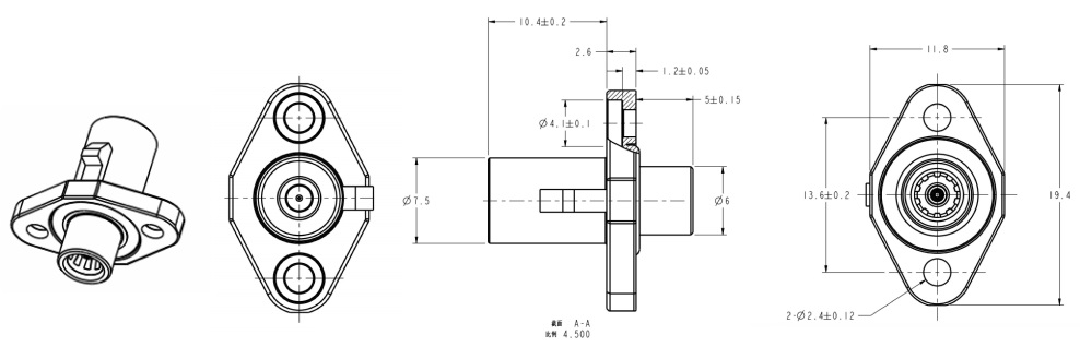 Typical Specifications Electrical Characteristics Impedance: 50Ω Frequency range: DC-4GHz Operating Voltage: 335 Volts rms Contact Current: 1A DC Max Center Contact Resistance: 5mΩ Max Outer Contact Resistance: 2.5mΩ Max Return Loss: 18 dB Min Insertion Loss: ≤0.1×√f(GHz)dB Insulation Resistance: 1GΩ Min