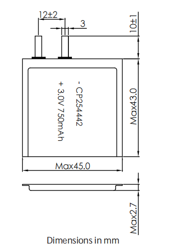 Lithium manganese pouch battery,Size 2.7*45.0*43.0mm,3V 750mAh,Temperature -20℃ ~ +70℃ KLS5-04-CP254442 |