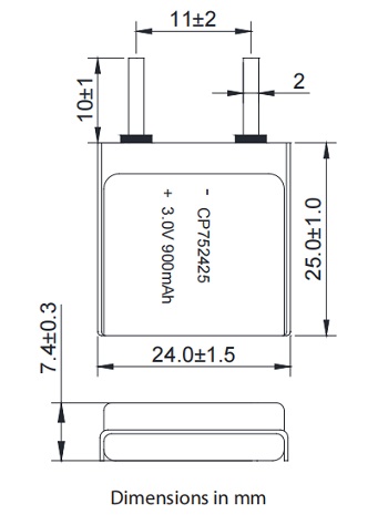 3.0 Volt Li-MnO2 Pouch Battery CP752425