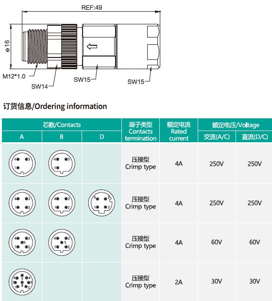 M12 Male Panel-mount, PCB Type, Front fastened,A B C D coding
