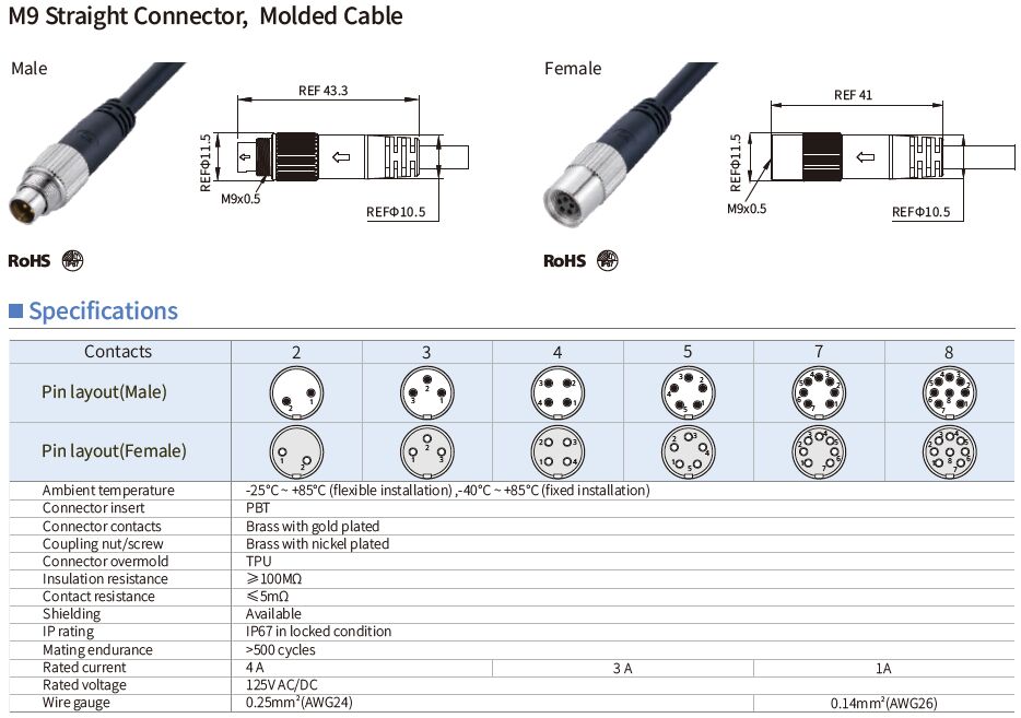 Order information: KLS15-M9A-P1-03-PUR-L2.0M-B-U M9: Screw type A: A Coding P1: Plug male pin,Straight 03: Number of contacts 2,3,4,5,7,8Pins Cable jacket: PUR or PVC Cable length:2.0M,3.0M,4.0M,5.0M...customized lengthes Cable colour: B-black W-With Shielded U-Un shielded