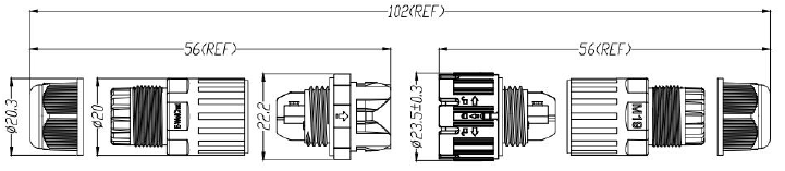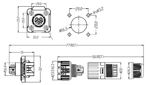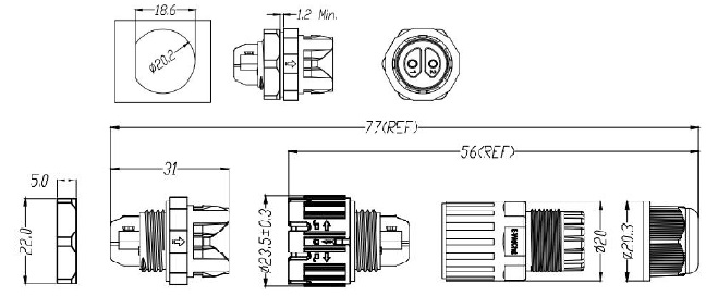 Number of Poles : 2/3 Pin Rated Voltage : 450V Rated Current : 20A Wire Section : 0.5-2.5mm2/0.5-1.5mm2 Outer Cable Diamcter : 3.5~7mm;5~8mm;7~10mm Mating Cycle : 1500 Mating Cycle Temperature Range : -40℃-+105℃ IP Code : IP68 Housing Material : PA66 Contact/Terminal Materials : Copper Alloy