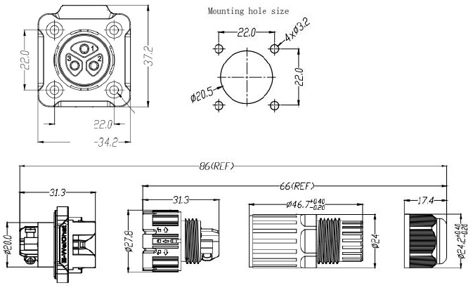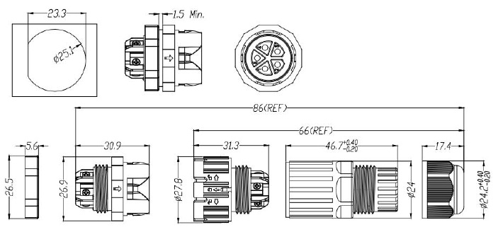 Number of Poles : 2/3/4/5Pin Rated Voltage : 450V Rated Current : 30A(2-3P),15A(4-5P) Wire Section : 5~9mm,9~12mm Mating Cycle : 1500 Mating Cycle Temperature Range : -40℃-+105℃ Wire Section : 0.5-4MM^2(2-3P),0.5-2.5MM^2(4-5P) Housing Material : PA66 Contact/Terminal Materials : Copper Alloy