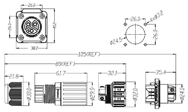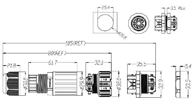 Number of Poles : 2/3/4/5/6Pin Rated Voltage : 450V Rated Current : 50A(2~4P),20A(5~6P) Wire Section : 5~9mm,9~12mm,10~14mm Mating Cycle : 1500 Mating Cycle Temperature Range : -40℃-+105℃ Wire Section : 0.5-4MM^2(2-4P),0.5-2.5MM^2(5-6P) Housing Material : PA66 Contact/Terminal Materials : Copper Alloy
