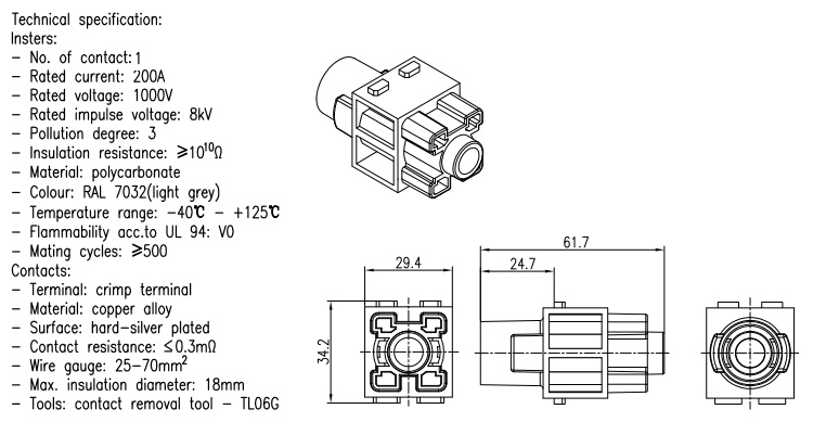 Power module,Crimp connection,Contacts 1,Female,200A/1000V