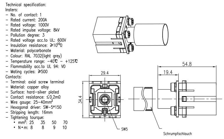 Power module,Axial bolt connection,Contacts 1,Male,200A/1000V KLS1-H2MKPE-001.1-M & KLS1-H2MKPE-001.2-M |