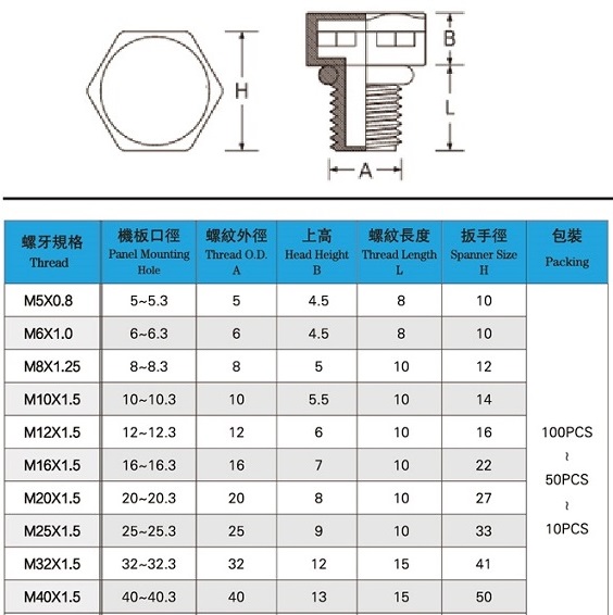 Thread:M5X0.8,M6X1.0,M8X1.25,M10X1.5,M12X1.5,M16X1.5,M20X1.5,M25X1.5,M32X1.5,M40X1.5