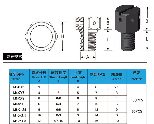 Thread:M3X0.5,M4X0.7,M5X0.8,M6X1.0,M8X1.25,M10X1.5,M12X1.5