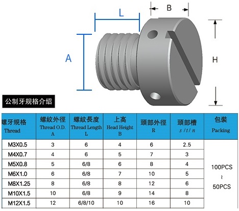Thread:M3X0.5,M4X0.7,M5X0.8,M6X1.0,M8X1.25,M10X1.5,M12X1.5
