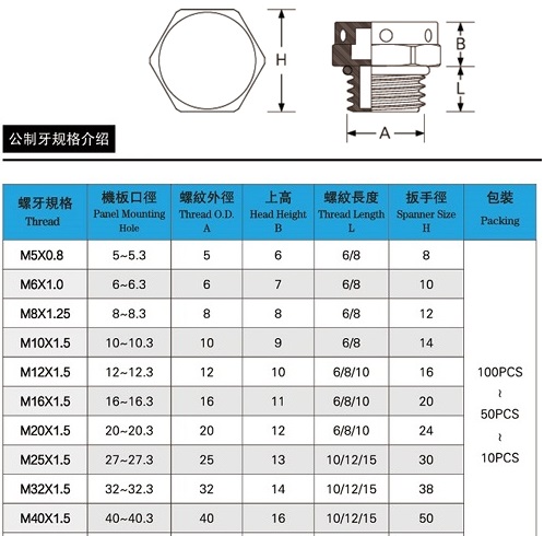 Thread:M5X0.8,M6X1.0,M8X1.25,M10X1.5,M12X1.5,M16X1.5,M20X1.5,M25X1.5,M32X1.5,M40X1.5