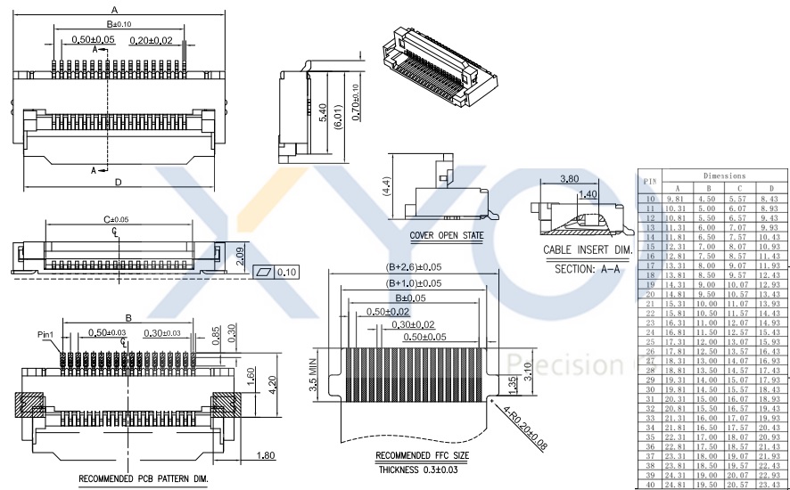 0.5mm hinged lock SMT H2.0mm bottom contacts 4-60P FPC/FFC connector