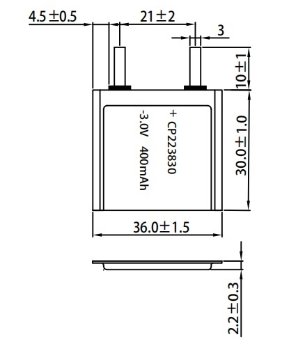 Lithium manganese pouch battery,Size 2.2*36.0*30.0mm,3V 400mAh,Temperature -20℃ ~ +70℃ KLS5-04-CP223830 |