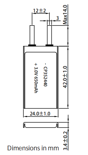 Lithium manganese pouch battery,Size 3.4*24.0*42.0mm,3V 650mAh,Temperature -20℃ ~ +70℃ KLS5-04-CP352440 |
