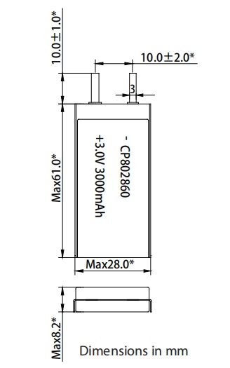 Lithium manganese pouch battery,Size 8.2*28.0*61.0mm,3V 3000mAh,Temperature -20℃ ~ +70℃ KLS5-04-CP802860 |