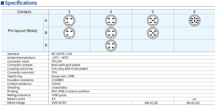 The M12 metric size A-Coding connectors, based on IEC 61076-2-101 standard, it is the most commonly used connector in the factory automation. M12 A-Coding connectors mainly designed for sensor and actuator devices. CABLEFORCE M12 A-Coding connectors are developed and designed for harsh industrial and climatic environments, e.g. High temperature range endurance, Hydrolysis resistant, Oil resistant, Corrosion resistant, UV-Resistant, Abrasion resistant, Bending and Drag Chain applicable.