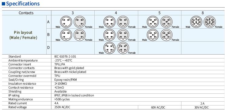 The M12 metric size A-Coding connectors, based on IEC 61076-2-101 standard, it is the most commonly used connector in the factory automation. M12 A-Coding connectors mainly designed for sensor and actuator devices. CABLEFORCE M12 A-Coding connectors are developed and designed for harsh industrial and climatic environments, e.g. High temperature range endurance, Hydrolysis resistant, Oil resistant, Corrosion resistant, UV-Resistant, Abrasion resistant, Bending and Drag Chain applicable.