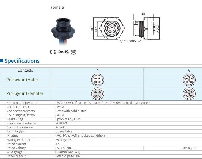 M12 Female Panel-mount, Solder Type, Front fastened,Quick lock KLS15-M12-Q1 |
