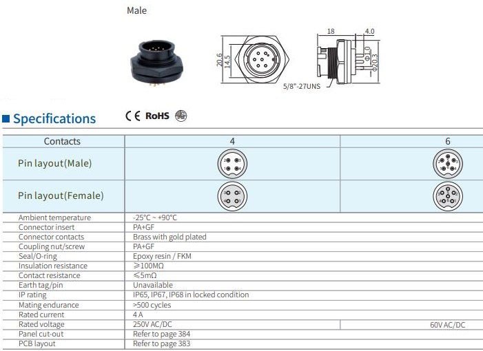 M12 Male Panel-mount, PCB Type, Front fastened,A B C D coding (M16x1.5)