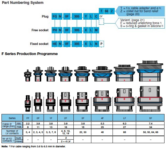 The F series connector is a compact Push-Pull connector designed initially for motorsports in 1995.