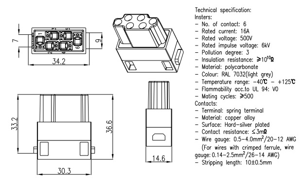 Power module,Spring connection (quick),Contacts 6,Male,16A/500V