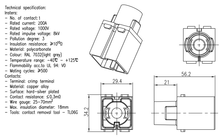 Power module,Crimp connection,Contacts 1,Female,200A/1000V