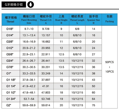 Thread:G1/8,G1/4,G3/8,G1/2,G5/8,G3/4,G7/8,G1,G1 1/8,G1 1/4,G1 1/2,G1 3/4,G2