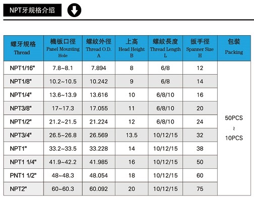 Thread:NPT1/16,NPT1/8,NPT1/4,NPT3/8,NPT1/2,NPT3/4,NPT1,NPT1 1/4,NPT1 1/2,NPT2