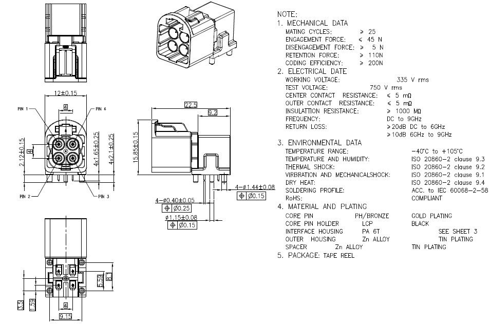 Mini fakra connector plug 2X2,spring pin for crimping RG174, RG316